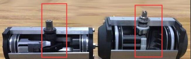 撥叉式氣動(dòng)執(zhí)行器(左)和齒輪齒條氣動(dòng)執(zhí)行器(右)內(nèi)部結(jié)構(gòu)區(qū)別